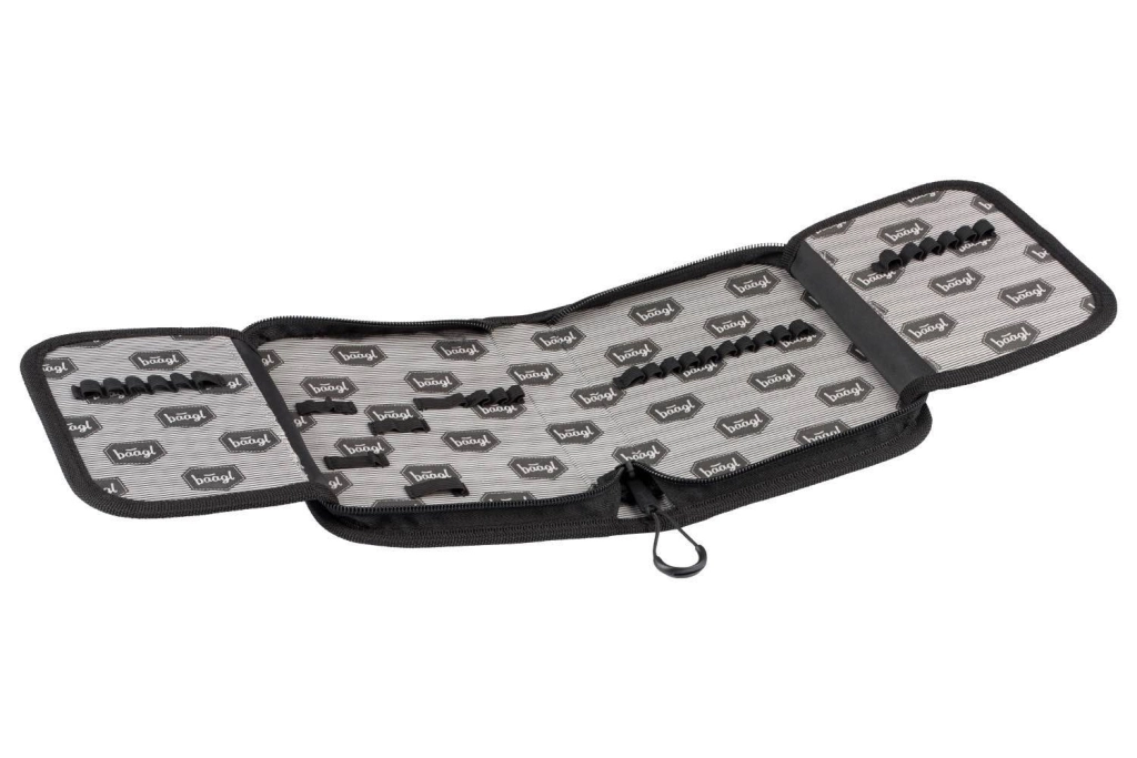 3 scomparti separati, organizer interno, elastico di fissaggio, tasca trasparente con orario
