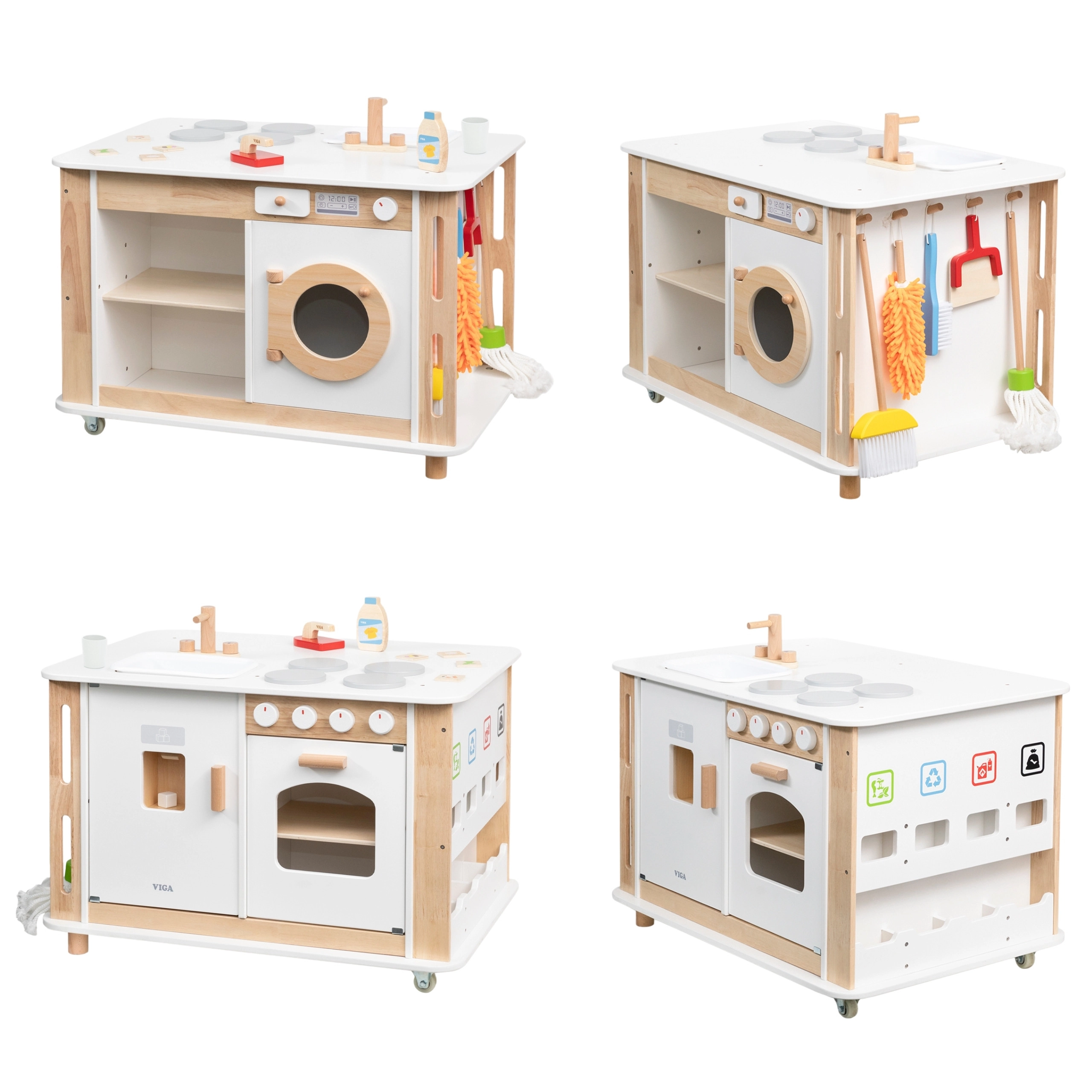 Questo centro domestico in legno 3 in 1 Viga trasforma la cameretta in un ambiente vivace ricco di imitazioni delle attività quotidiane. I bambini possono cucinare al fornello con manopole, cuocere nel forno, “lavare” i vestiti nella “lavatrice”, lavare i piatti nel lavello e imparare a differenziare i rifiuti con pezzi contrassegnati a colori. Grazie alle due ruote pivottanti, l'intera postazione è facile da spostare ed è perfetta per il gioco condiviso.