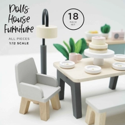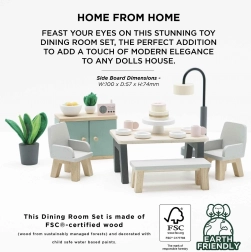 Questo affascinante set da pranzo è realizzato con legno di alta qualità certificato FSC e porta in ogni casetta delle bambole un tocco di sofisticatezza. Comprende 18 elementi, inclusi tavolo, due poltrone, panca, lampada, credenza e accessori decorativi, come piante, fruttiera e torta. Questo set non solo è bello da vedere, ma supporta anche le capacità cognitive e comunicative dei bambini. È decorato con colori non tossici a base d'acqua ed è compatibile con altre casette per bambole Le Toy Van.