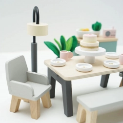 Set da pranzo in legno perfetto per casetta delle bambole, che combina eleganza moderna e design sostenibile del marchio Le Toy Van. Ideale per lo sviluppo dell'immaginazione infantile.
