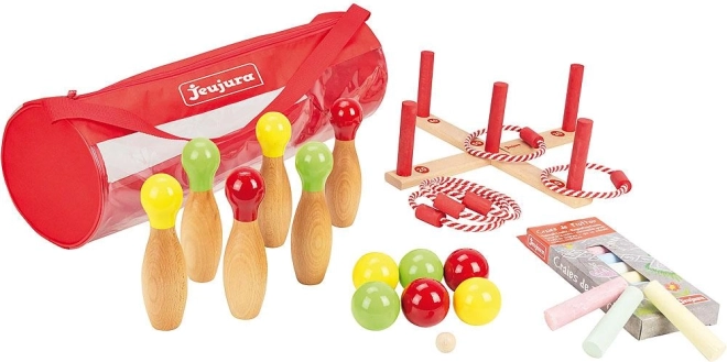 Il set di giochi da esterno Jeujura è ideale per qualsiasi area giochi per bambini. In questo set pratico troverete tutto il necessario per giochi divertenti come campana o bowling. Tutto è realizzato in legno di alta qualità e colori a base d'acqua, garantendo sicurezza e durata.