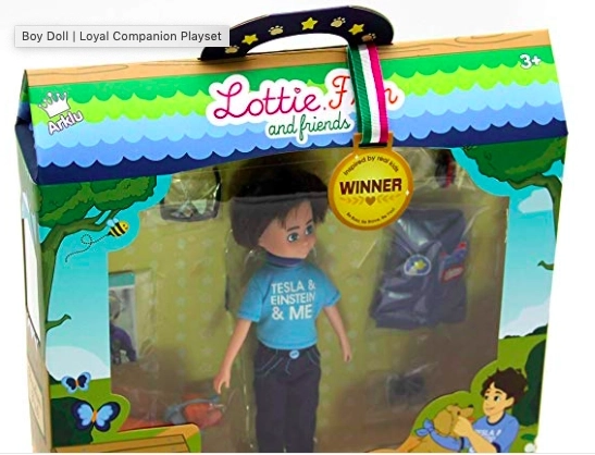 Lottie Finn è un bambolotto moderno che ispira i bambini alla gentilezza, al coraggio e all’esplorazione dello spazio. Grazie al vinile morbido privo di ftalati è piacevole al tatto e la sua struttura stabile consente di stare in piedi da solo e di assumere pose realistiche. La maglietta alla moda “TESLA & EINSTEIN & ME”, i jeans e le sneakers blu sono completati dal fedele compagno – il cagnolino Cookie.