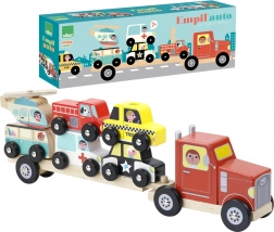 Colorato set in legno con camion e rimorchio che offre ore di divertimento creativo per bambini dai 2 anni. Sul lungo rimorchio si possono posizionare 6 veicoli: taxi, auto della polizia, autopompa dei pompieri, ambulanza, elicottero e minibus. Il giocattolo è realizzato in legno e metallo di qualità, ha una finitura liscia e favorisce la motricità fine, la coordinazione occhio–mano e la fantasia. Il design è firmato dalla rinomata illustratrice Ingela P. Arrhenius.