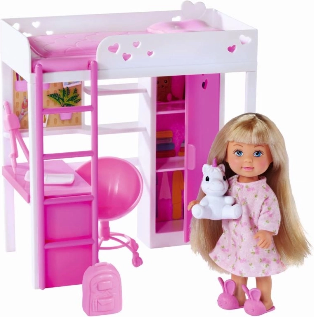 Scopri la cameretta incantata dove la bambola Evi trascorre il tempo giocando, studiando e riposando. Il moderno letto a soppalco con scala fa risparmiare spazio e sotto ospita un comodo angolo studio con scrivania e spazio contenitivo. Il tutto in tonalità bianco–rosa con delicati cuoricini che faranno felice ogni piccola designer.
