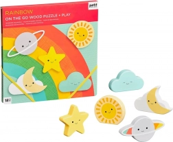 Puzzle in legno resistente per i più piccoli dai 18 mesi. 5 pezzi in legno, 2 scenari di gioco e l'allegro motivo dell'arcobaleno favoriscono la motricità fine, la concentrazione e la gioia della scoperta. Realizzato in legno e carta riciclata.