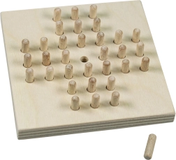 Il solitario in legno Detoa offre un divertimento intelligente in un formato compatto. La partita inizia rimuovendo il piolo centrale e prosegue saltando i pioli adiacenti orizzontalmente o verticalmente. Ogni piolo saltato viene rimosso dalla plancia: pianifica le mosse in anticipo e prova a lasciare alla fine un solo piolo.
