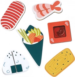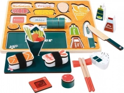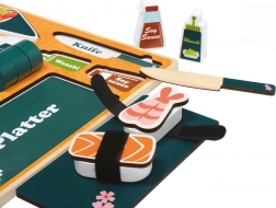 Il set include componenti in legno come sushi, salse, posate e un coltello per "tagliare", che permette un gioco realistico e creativo. Questo gioco è adatto a bambini dai 36 mesi, ma si consiglia la supervisione di un adulto per bambini al di sotto dei 3 anni.