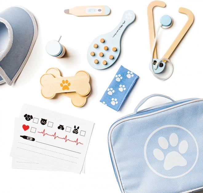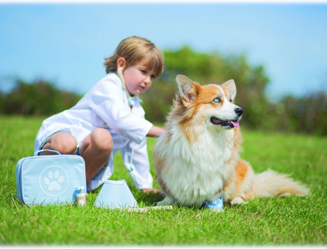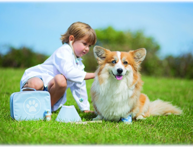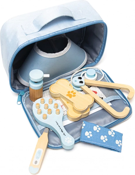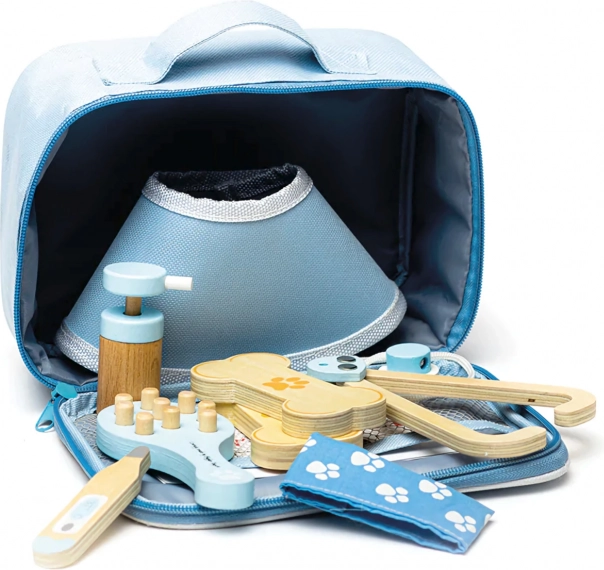 La valigetta veterinaria completa consente ai bambini di prendersi cura di peluche e figurine di animali domestici come un vero dottore. Nel set non mancano strumenti come stetoscopio, termometro, otoscopio, siringa, benda, spazzola, collare protettivo e altri accessori. Il tutto è riposto in una resistente borsa in tessuto con impronta di zampa, ideale per il trasporto e la conservazione.