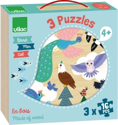 Scoprite il meraviglioso mondo della natura attraverso questo set di puzzle di legno. Ogni immagine delle tre presenta un tema diverso: avventure tra le nuvole, il mondo sottomarino e avventure nella giungla. La scena nel cielo è impreziosita da un bellissimo pavone, un'aquila e altri uccelli. I motivi marini sono animati da una grande balena, un polpo e pesci amichevoli. La scena terrestre include una tigre, un coccodrillo e un pappagallo in un allegro ambiente giungla.