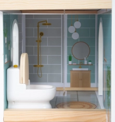 La confezione include 8 pezzi di arredo e dettagli pratici per un gioco autentico: toilette apribile, mobili della cucina e frigorifero con sportelli e cassetti. I cuscini e la biancheria donano alla camera da letto un tocco accogliente, mentre la scala a chiocciola collega i due piani con un interior studiato e una parete doccia in plexiglass.