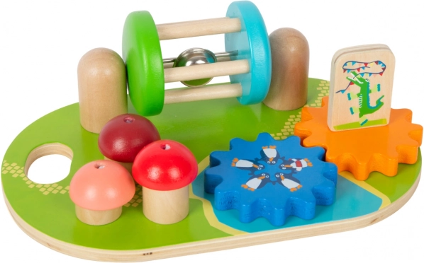 La tavola in legno offre diversi elementi mobili come ingranaggi e spugnette per lo sviluppo della motricità fine.