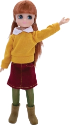 Bambola in abito autunnale - maglioncino giallo, gonna rossa, collant verdi e stivali marroni. Ideale per passeggiate autunnali.