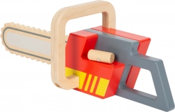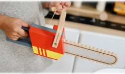 Questa motosega giocattolo in legno di alta qualità combina costruzione resistente e design sicuro per il gioco quotidiano. Gli elementi rosso e giallo accesi con la forma realistica della motosega stimolano la fantasia e sviluppano il gioco di ruolo e la motricità fine.