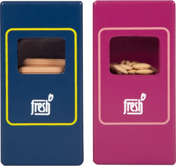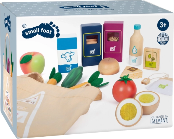 Il set di alimenti vegetariani Fresh offre ai bambini tutto ciò di cui hanno bisogno per giochi creativi da cucina e da negozio. I pezzi in legno come latte, burro, formaggio, olio, uova, riso, pasta, prodotti da forno, mela, pomodoro, cetriolo e carota sono completati da una bottiglia d’acqua e una bustina di tè. I dettagli realistici, inclusa la finestrina nelle confezioni di riso e pasta (emettono suono quando vengono scossi), aumentano l’attrattiva e l’autenticità del gioco.