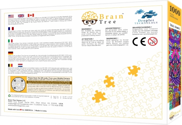 Il puzzle BRAIN TREE Animali Tribali offre un motivo visivamente coinvolgente, ricco di colori e dettagli, valorizzato dalla stampa premium e dalla superficie opaca. Ogni pezzo è tagliato in modo unico, rendendo il montaggio più divertente e sorprendente rispetto ai classici tagli a griglia.