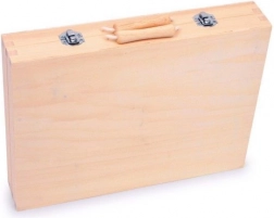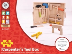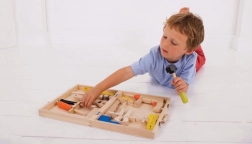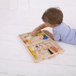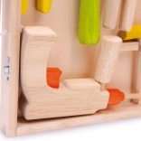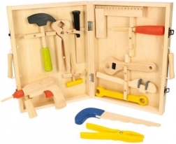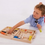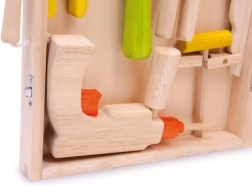 Fantastica valigetta degli attrezzi di legno per tutti i giovani appassionati di fai-da-te che desiderano sviluppare le loro abilità artigianali. Contiene martello, pinze, trapano e chiavi per dadi, tutto fatto con materiali di alta qualità.