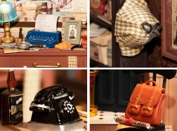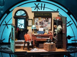 Macchina da scrivere, bacheca con indizi, telefono e cappello: ogni miniatura crea l’atmosfera di un’agenzia investigativa britannica.
