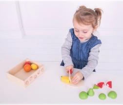 Questo set accuratamente realizzato comprende i frutti più amati – mela, pera, arancia, limone, fragola, banana e anguria – insieme a un coltello in legno e a un tagliere. I singoli frutti sono suddivisi in pezzi che durante il “taglio” si separano in modo sicuro e si possono riunire facilmente. Il legno di qualità, i bordi levigati e la costruzione robusta garantiscono un gioco confortevole e sicuro.
