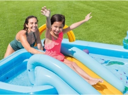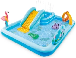 Trasforma il giardino in un mondo acquatico di svago con il centro giochi INTEX. L’ampio scivolo con morbido tappetino assicura un atterraggio dolce e sicuro, mentre il guado poco profondo e la piscina più grande offrono fresco ristoro nelle giornate calde. L’irrigatore/fontana con regolazione del flusso d’acqua aggiunge una nuova dimensione al gioco.