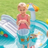 Questa piscina del marchio INTEX include elementi di gioco come un'anatra gonfiabile e un secchio da pesca, che aumentano il divertimento e la creatività dei bambini mentre giocano nell'acqua. È disponibile anche un volante gonfiabile, che dà ai bambini la possibilità di giocare a vari giochi.