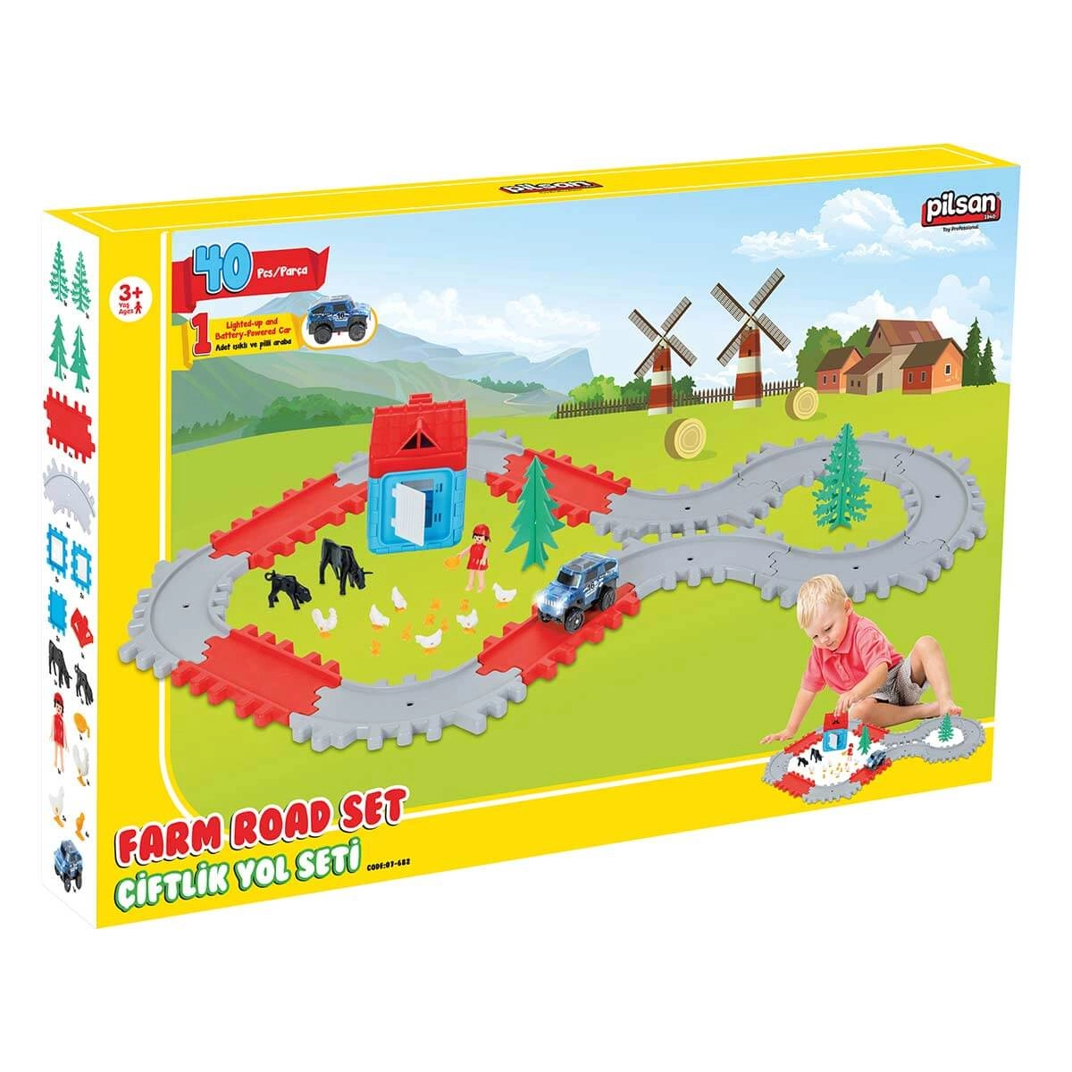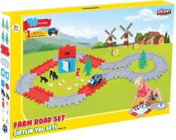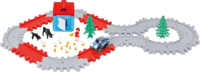 Pista stradale con animaletti e casetta. Nella confezione è inclusa una macchinina a batteria. Le dimensioni della pista montata sono 98 cm di lunghezza e 61 cm di larghezza.