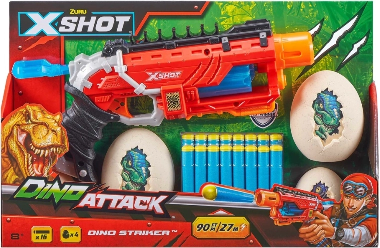 Attenzione! I dinosauri stanno attaccando! Distruggi le loro uova e impedisci la loro ulteriore riproduzione. Quest’arma unica ti permette di colpire fino a una distanza di 27 metri. Il caricatore rotante consente un fuoco rapido. Inoltre puoi fissare i proiettili di riserva ai pratici supporti nella parte superiore dell’arma. L’arma è sicura, realizzata in plastica di alta qualità e permette una mira precisa. Età: 8+, contiene: arma, 16 proiettili e 3 uova di dinosauro.