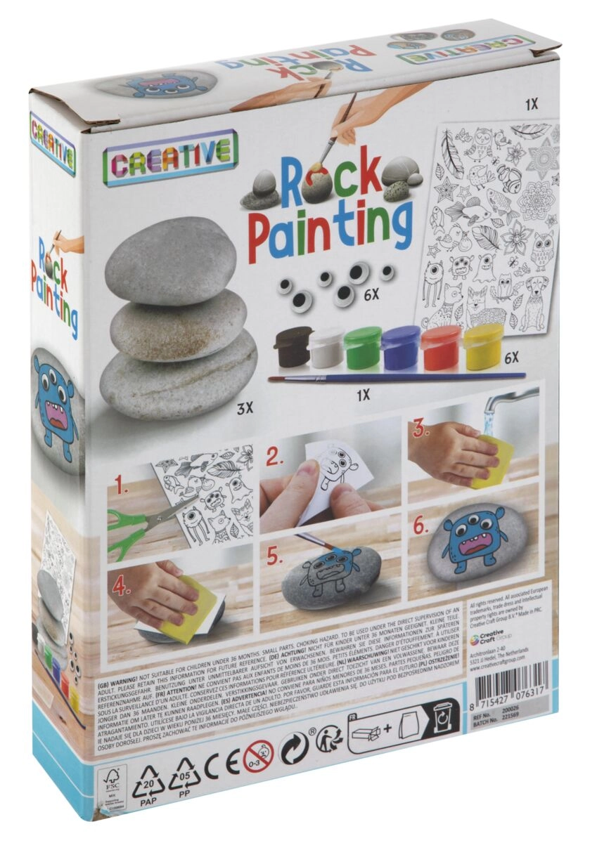 Questo set creativo trasforma semplici sassolini in simpatici mostriciattoli, pesci, faccine e altre decorazioni originali. Basta applicare un motivo adesivo, aggiungere occhi mobili e rifinire con sei colori intensi. Grazie al pennello incluso e ai ciottoli lisci, i bambini creeranno bellissimi lavoretti anche senza esperienza.