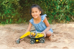 Il braccio con pala si controlla con una comoda maniglia, così i bambini possono davvero caricare e spostare la sabbia come un vero escavatore.