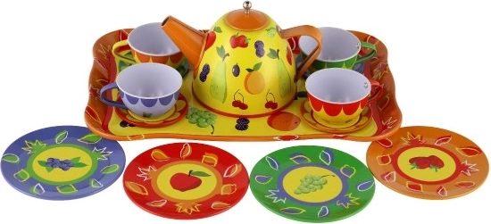 Questo set da tè in latta per bambini porta gioia nel gioco di servizio immaginario e nella socialità. Il set è realizzato in metallo, quindi è solido, resistente e leggero per le piccole mani. I motivi colorati con fiori, farfalle e frutta stimolano creatività e immaginazione, mentre il vassoio da portata facilita il trasporto e il gioco.