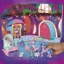 Il set include uno sfondo decorativo di camera da letto in cartoncino, un tavolo pieghevole con attivazione Hoof to Heart e numerosi accessori che Izzy può davvero “tenere con lo zoccolo”. Premendo lo zoccolo sul pedale, il fiore si trasforma in un tavolo aperto: perfetto per il tè delle cinque. Gli adesivi permettono di decorare la scena e gli accessori.