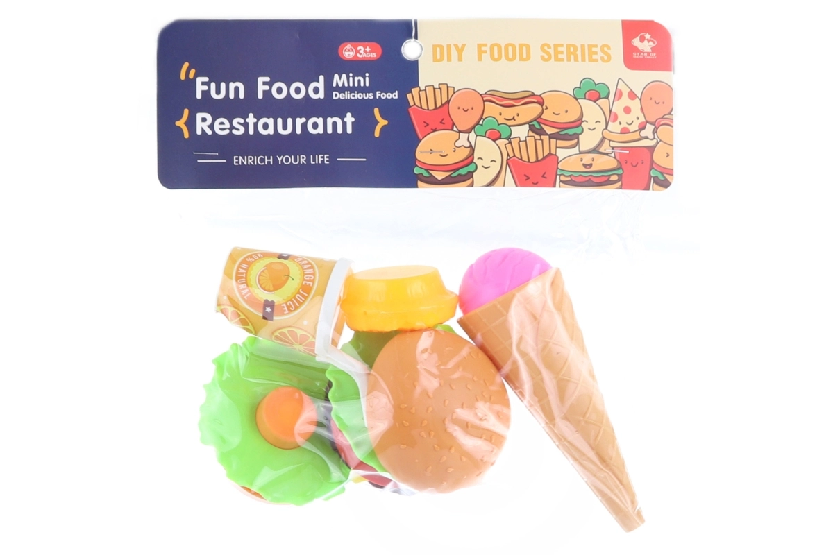 Divertente set di cibo per la cucina dei bambini con hamburger scomponibile, gelato in cono, torta e bevanda. Ideale per giochi di cucina e negozio. Favorisce lo sviluppo della fantasia, la motricità fine e il gioco sociale. Adatto ai bambini dai 3 anni.