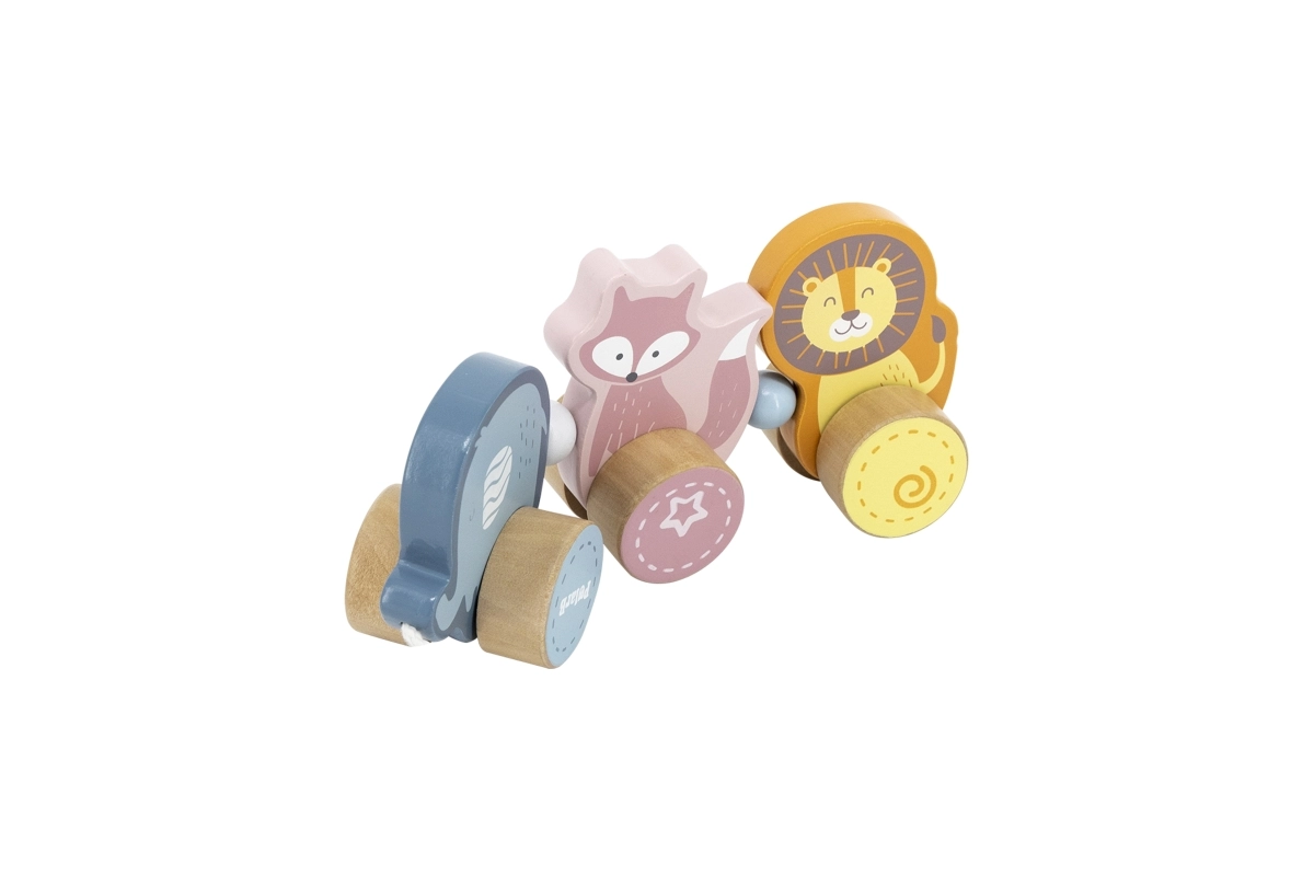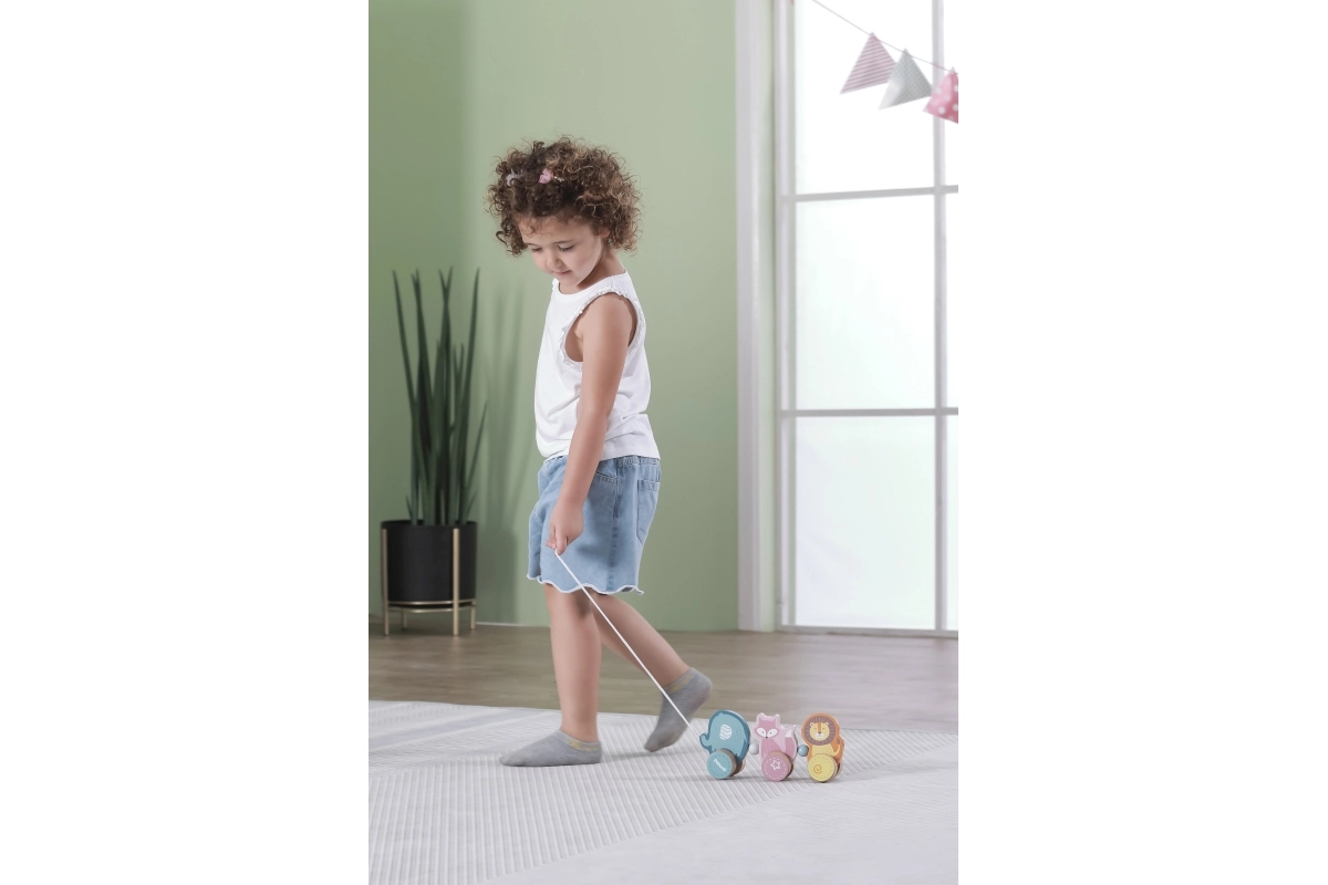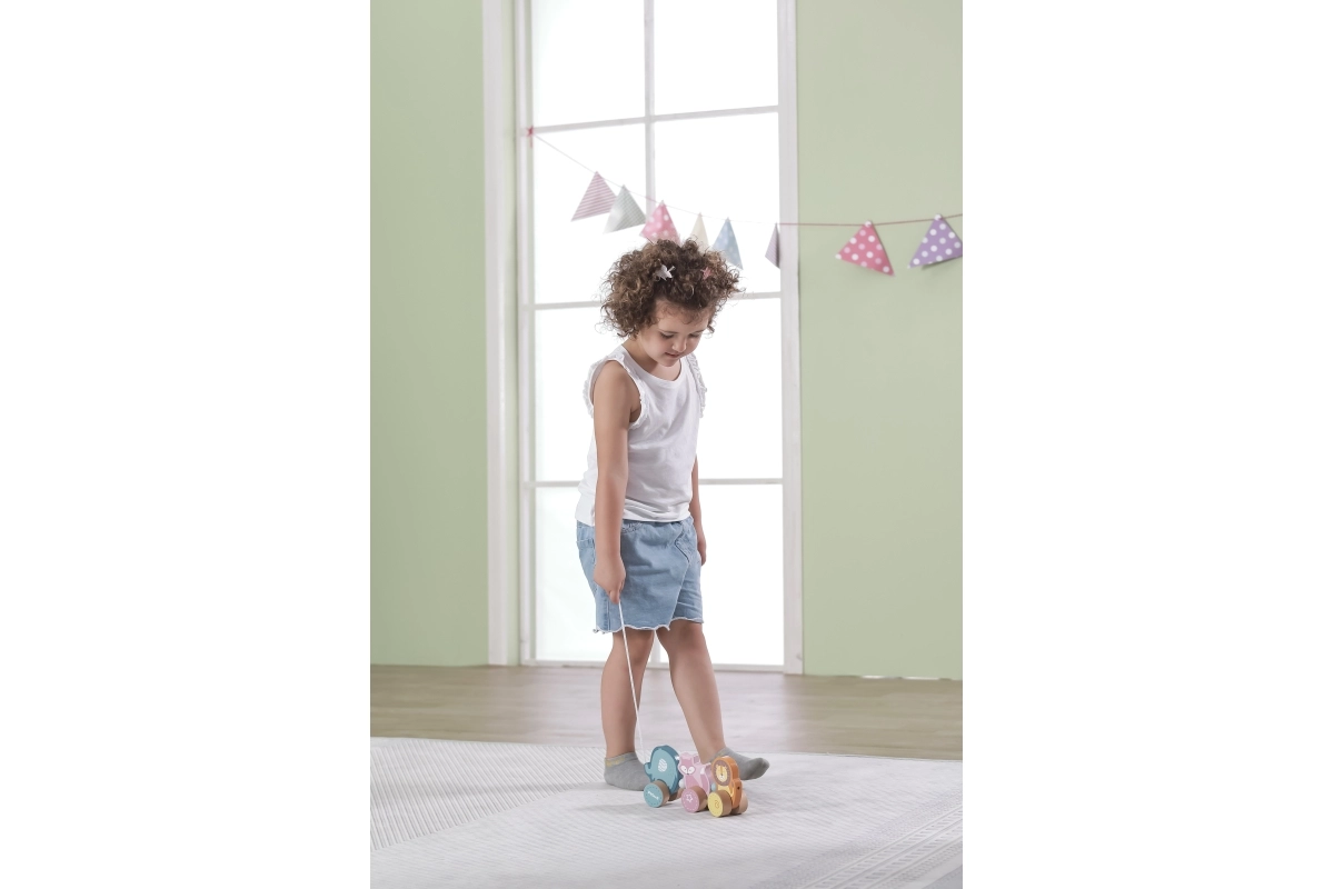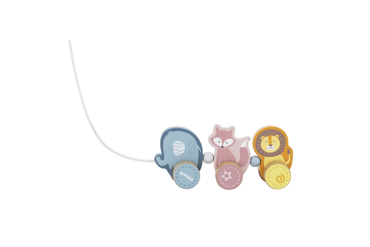 Questo gioco da traino in legno di alta qualità, nelle delicate tonalità pastello, è progettato per i più piccoli che imparano a camminare e a scoprire il mondo. Tre adorabili animaletti – elefante, volpe e leone – sono collegati tra loro e scorrono facilmente su ruote di legno. Grazie alla robusta cordicella da traino, i giocattoli si guidano con facilità, motivano i bambini al movimento e sviluppano naturalmente equilibrio e coordinazione.