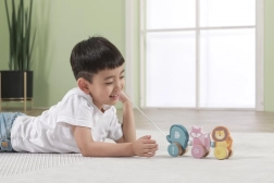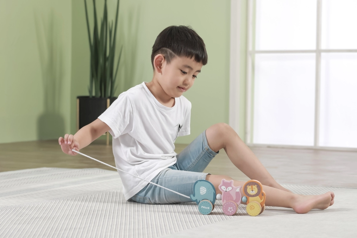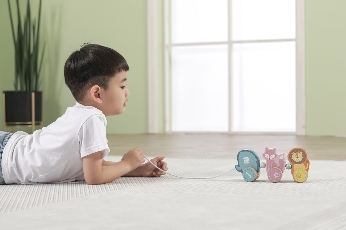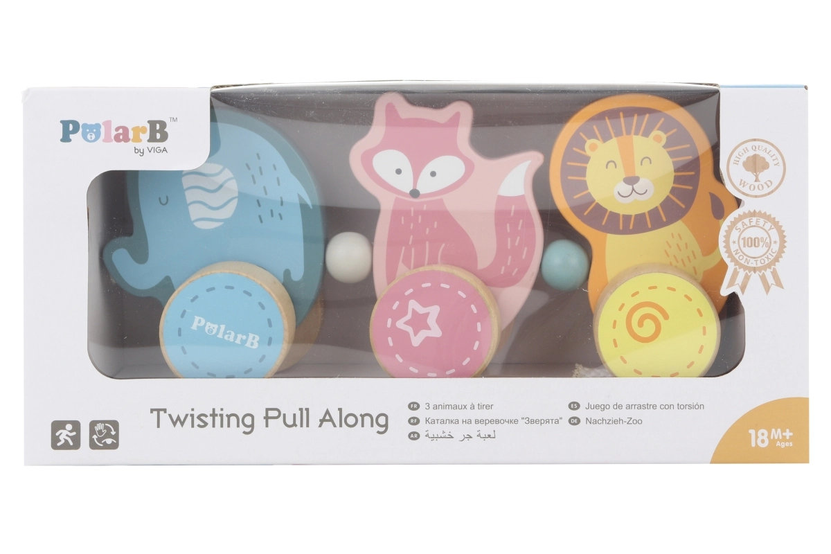 Questo gioco da traino in legno di alta qualità, nelle delicate tonalità pastello, è progettato per i più piccoli che imparano a camminare e a scoprire il mondo. Tre adorabili animaletti – elefante, volpe e leone – sono collegati tra loro e scorrono facilmente su ruote di legno. Grazie alla robusta cordicella da traino, i giocattoli si guidano con facilità, motivano i bambini al movimento e sviluppano naturalmente equilibrio e coordinazione.