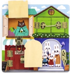 Questa tavola in legno di qualità, ispirata al metodo Montessori, offre quattro porticine con vere serrature e catenacci, che il bambino apre e chiude gradualmente. Ogni apertura rivela allegri animaletti, stimolando curiosità e concentrazione.
