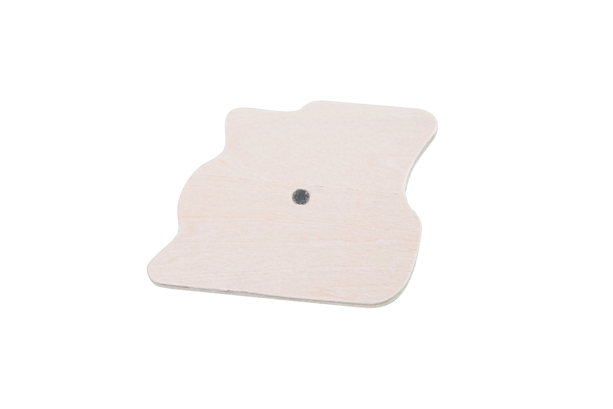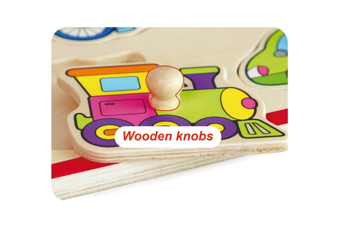 Ogni pezzo ha una manopola in legno che permette ai bambini di sollevarlo facilmente e inserirlo con precisione nella sua sede – ideale per allenare la motricità fine.