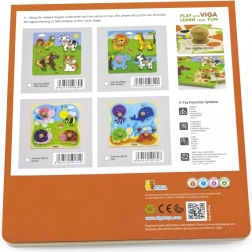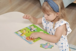 La base in legno stabile con bordi fresati assicura che i pezzi restino ben fermi e allo stesso tempo favorisce la percezione delle forme, la pazienza e il pensiero logico. Il puzzle è ideale per la prima conoscenza degli animali e lo sviluppo del linguaggio.