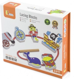 Divertente set a tema pirati per i più piccoli che sviluppa motricità fine, coordinazione occhio–mano e creatività. Contiene 12 blocchi di legno e un lungo laccetto per infilare, confezionato in una pratica scatola che funge da box contenitore. Adatto da 24 mesi.