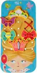 Il set di infilatura in legno Principessa offre un apprendimento giocoso e tanto divertimento creativo. Su una grande tavoletta con la principessa, i bambini possono creare le proprie acconciature e decorarle con corone, fiocchi e farfalline, fissandole con i lacci nei fori predisposti. L’attività favorisce pazienza, concentrazione e sviluppo della motricità fine.