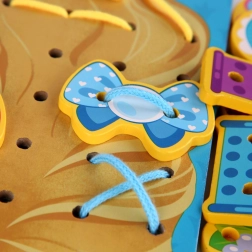 L’infilatura e il passaggio nei fori rafforzano i muscoli delle dita, la coordinazione occhio–mano e la concentrazione. Attività ideale per i bambini in età prescolare.