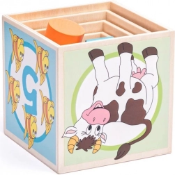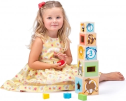 La torre in legno con bicchieri e ordinatore di forme unisce la costruzione in altezza all'esercizio di inserire le forme giuste nei fori corrispondenti. I bambini sviluppano la coordinazione occhio–mano, imparano colori, numeri e animaletti e si divertono con un gioco creativo.