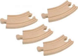Questo set di 4 binari curvi corti è un ottimo complemento per qualsiasi pista ferroviaria in legno. Grazie alla lunghezza di 10 cm per pezzo, potrai creare con facilità archi compatti, raccordi e nuove forme di tracciato. I binari si connettono in modo intuitivo e sono adatti a piccoli costruttori dai 3 anni.