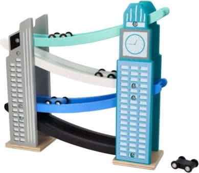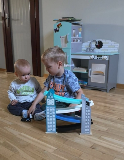 La nostra pista in legno è progettata per richiamare le iconiche costruzioni cittadine, inclusa una torre con orologio. È realizzata in legno di alta qualità e offre diversi livelli con rampe colorate in blu, nero e bianco. I bambini si divertiranno a far scendere le piccole macchinine colorate dalla cima fino in fondo. La pista non solo intrattiene, ma sviluppa la motricità fine e insegna principi fisici come gravità e velocità.