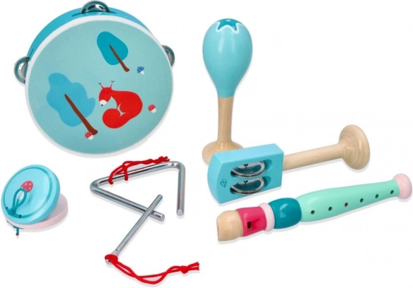 Tamburello con motivo volpe/scoiattolo, maracas, triangolo, armonica e altri strumenti nelle piacevoli tonalità menta allenano il senso del ritmo e la coordinazione delle mani.
