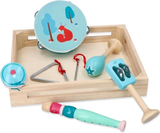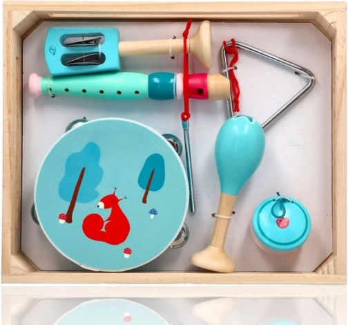 Nel set trovi un tamburello con quattro sonagli e un simpatico scoiattolo, un flauto color menta, maracas con motivo floreale, nacchere con funghetto, campanelli a mano con fogliolina, triangolo in metallo con bacchetta e tutto riposto in un pratico vassoio/scatola in legno per un facile riordino e trasporto. Perfetto per fare musica a casa, all’asilo e nel doposcuola.