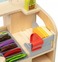 Accessori come “olio e aceto”, bicchierino, vassoio e piccoli elementi per il pagamento stimolano il gioco sociale e la comunicazione tra i bambini.