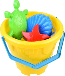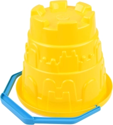 Il secchiello di plastica con manico blu e le formine all'interno permettono un facile trasporto in spiaggia o in giardino.
