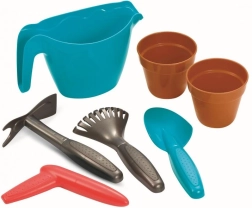 Annaffiatoio, 2× vaso, pala, rastrello, zappa, palo da trapianto