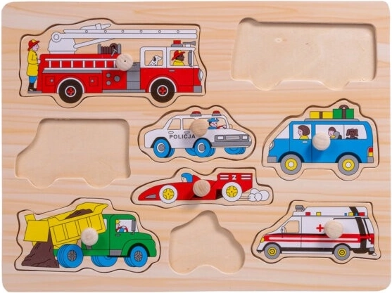 Scoprite il divertente puzzle in legno con pomelli a tema veicoli, che aiuta i bambini a sviluppare la motricità fine, le abilità cognitive e il riconoscimento di forme e colori. Nove robusti tasselli con comodi pomelli in legno si afferrano facilmente e si inseriscono nelle posizioni corrette – ideale per i piccoli amanti di auto, treni e altri mezzi.