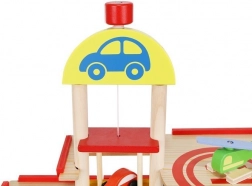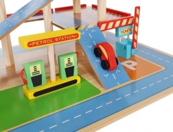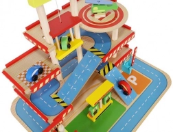 Scoprite il robusto parcheggio in legno con garage che offre tre piani di gioco collegati da rampe, un ascensore funzionante e un eliporto superiore. I bambini apprezzeranno elementi realistici come autolavaggio, stazione di servizio e vendita dei biglietti, che danno vita a scenari di traffico autentici.