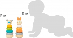 Un giocattolo in legno senza tempo che cresce con il tuo bambino. I bambini selezionano e infilano gli anelli sull’asta, li dispongono per dimensione e scoprono i colori. Le figurine del coniglietto e dell’orso invogliano al gioco e al tempo stesso decorano la cameretta con il loro delicato look pastello.